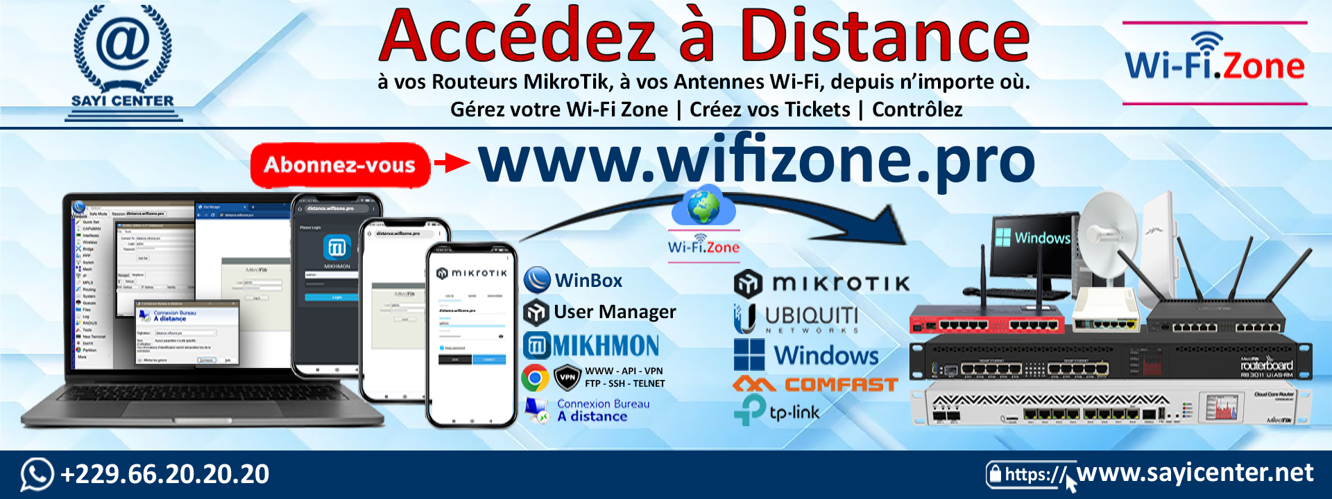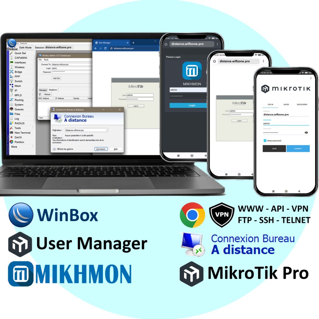 Utilisez les Applications WinBox, User Manager, Mikhmon, MikroTik Pro, API, les Navigateurs, ... pour Accéder à Distance à tous vos Routeurs, Antennes, Ordinateurs, Caméra, ... à travers le Server VPN de www.wifizone.pro